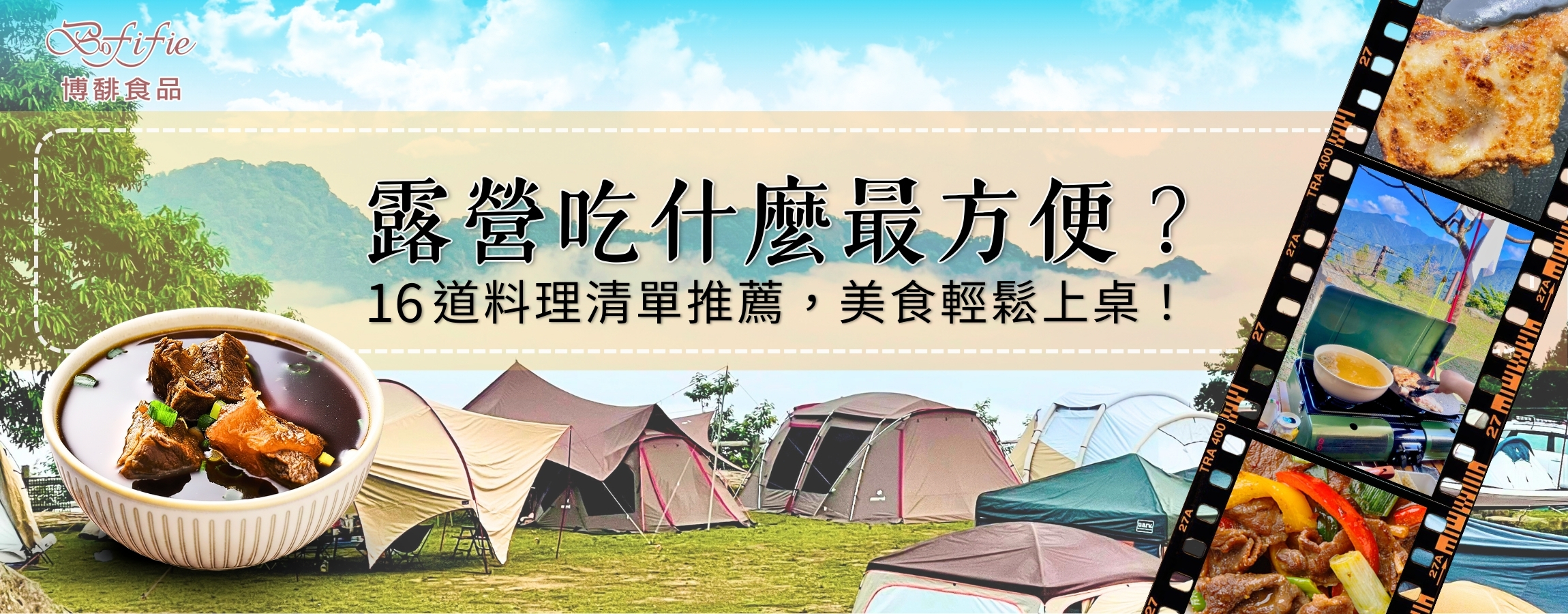 當你在收拾帳篷、整理裝備時,是否也在煩惱:「露營吃什麼最方便?」其實只要準備對了,露營料理一點也不麻煩,反而能變成讓人期待的行程亮點。無論是烤肉、鍋物到免開火便當菜,只要搭配簡單食材和實用小道具,就能讓山林裡的每餐變得輕鬆美味又有儀式感。這次,本文特別整理了16道超實用的露營料理清單,讓你在野外也能輕鬆吃美食不將就! 露營吃什麼最方便?新手到高手都推薦的料理準則!許多人一到超市就開始瘋狂採買,結果露營回來發現食材還沒開封就變質,或吃不完只能丟掉,不但浪費金錢,也增加廚餘處理的困擾。其實只要掌握3個簡單的備餐原則,無論是第一次露營的新手,還是經驗老道的露營咖,都能輕鬆搞定「露營吃什麼最方便」的問題!準則1. 精準計算「人、天、境」買菜時別再憑感覺採買了!請依照以下公式思考備餐數量:區域夜晚氣溫低時,高熱量湯品是首選:將成員分為「戰力組」(成年男性/發育期青少年/大食量者)與「氣氛組」(兒童/小鳥胃)。通常成人一餐肉類約需200~300g,澱粉類約150g。天數規劃:3天2夜的露營,通常需要準備5~6餐。建議「第一晚」吃最豐盛(剛抵達體力好、食材最新鮮),「第二天午餐」吃最簡單(可能外出遊玩),「最後一天早餐」吃最快速(為了撤帳)。天候與環境:高海拔營區夜晚氣溫低,高熱量湯品是首選;夏天低海拔則需要清爽涼拌或酸辣開胃的料理。準則2. 輕量化與耐存放冰箱空間是露營車或後車廂最珍貴的資源:去骨、去殼、去包裝:在家裡先將肉類分裝醃漬,蔬菜洗淨切好放入保鮮盒或真空袋。這樣到營區不僅省去清洗時間與秏時備料,垃圾量也可減少約70%的垃圾量。選擇耐摔耐壓食材:根莖類(馬鈴薯、洋蔥)比葉菜類適合露營;如果有葉菜類,建議第一天就煮掉(因為保存不易)。準則3. 高變化性的「百搭食材」選擇可以「一材多用」的食材,例如:一包培根,早餐可以夾吐司,晚餐可以炒高麗菜,宵夜可以捲金針菇。一罐肉燥罐頭,中午拌麵,晚上淋在燙青菜上。或是選擇冷凍調理食品因為不用特別處理也非常快速便利。露營料理器材要準備哪些?食材如何保存?工欲善其事,必先利其器!想在戶外優雅上菜,不需要整套廚房搬出門,只要備好幾樣露營料理器材,無論是一人露、情侶露營還是家庭出遊,都能煮得省力又開心:防風卡式爐/雙口爐:不同於家用卡式爐,戶外專用爐具通常具備「導熱片」(防止瓦斯罐低溫失壓)與「防風圈」,同時也擁有更強火力減少食材烹煮時間。如果預算足夠,雙口爐能讓你一邊煮湯、一邊煎牛排,效率翻倍。鑄鐵鍋或深炒鍋:鑄鐵鍋是露營人的浪漫,蓄熱性極佳,隨便煎個牛排或加熱調理包都很有風味,甚至可以直接端上桌當盤子,保溫又美觀。噴槍:加熱即食的料理包有時候色澤不夠誘人?用噴槍在肉片表面炙燒一下,梅納反應的焦香味瞬間出來,視覺與味覺馬上提升到居酒屋等級。戶外食安不馬虎!露營食材保鮮與存放指南露營時最常見的失誤之一,就是忽略食材保存方式。尤其在臺灣,氣候潮濕、日夜溫差大,若處理不當,很容易讓食材變質。以下推薦幾個適當的食物包存方法: 項目類別推薦工具/方法適用對象與情境建議存放食材/用途補充說明保冷設備硬式冰箱/行動冰箱插電式或非插電冰箱、使用凍水瓶取代冰塊需長時間保冷者,適合兩天以上行程第二天以後要吃的肉類(如:和牛、雞腿排、海鮮等)保冰力佳,凍水瓶可飲用又不會滲水軟式保冷袋保冷袋、冰寶當天即將料理的食材/常用飲品飲料、雞蛋、第一天要煮的蔬菜或肉類拿取方便但保冰時間較短,不適合存放易腐食材保冷分層底層放冰塊或冷源最下層需維持冷凍狀態的食材冷凍肉品、海鮮冰源在下層溫度最低,保冷最久中層冰源中段位置需冷藏食材但不需冷凍者冷藏肉類、起司、奶油等保持低溫但避免凍結狀態上層靠近冰箱上蓋頻繁取用、怕凍傷的食材飲料、蔬菜、雞蛋容易取出,建議避免放葉菜過冷凍傷食材預處理建議真空包裝、食材先切洗處理想省時省垃圾、保持食材新鮮各類肉品、蔬菜、調理包減少備料與垃圾量,便於快速上菜保存技巧真空包裝真空機或市售真空即食包不想多洗餐具、想加快出餐者舒肥雞胸、肉燥包、即食咖哩等可直接隔水加熱、延長保存期限,是露營吃什麼最方便的好幫手露營料理清單推薦:僅需加熱+擺盤,就能享受 16 道餐廳級美味!「露營吃什麼最方便?」這份露營料理推薦清單幫你一次搞定。這邊特別整理了16道只需簡單加熱、擺盤,就能重現餐廳風味的露營菜色,再搭配一點巧思,不用大廚等級的技巧,也能讓你成為整個營區最會煮的那一位!1. 爆漿起司豬排漢堡食材:炭烤豬排/漢堡排、漢堡麵包、起司片、生菜。作法:將豬排退冰後中火煎熟,加起司片悶30秒融化後,將麵包乾煎後夾入所有材料。亮點:比早餐店還好吃的爆漿漢堡,只要10分鐘就能上桌!2. 奢華雞湯粥食材:冷凍熟飯、雞湯調理包、香菇、蔥花。作法:湯包加熱後加入熟飯與香菇煮滾,撒上蔥花即可。亮點:不用熬粥也能喝到暖呼呼的早晨元氣湯品!3. 熱壓吐司佐白醬雞肉食材:吐司、白醬雞肉料理包、莫札瑞拉起司。作法:將餡料與起司夾入吐司中,用熱壓機壓3分鐘。亮點:外酥內軟超爆漿,小朋友一定搶著吃。4. 培根紅醬義大利麵食材:義大利麵、紅醬培根料理包、起司粉。作法:麵條煮熟後與醬包拌炒均勻,撒起司粉裝飾。亮點:義式風味